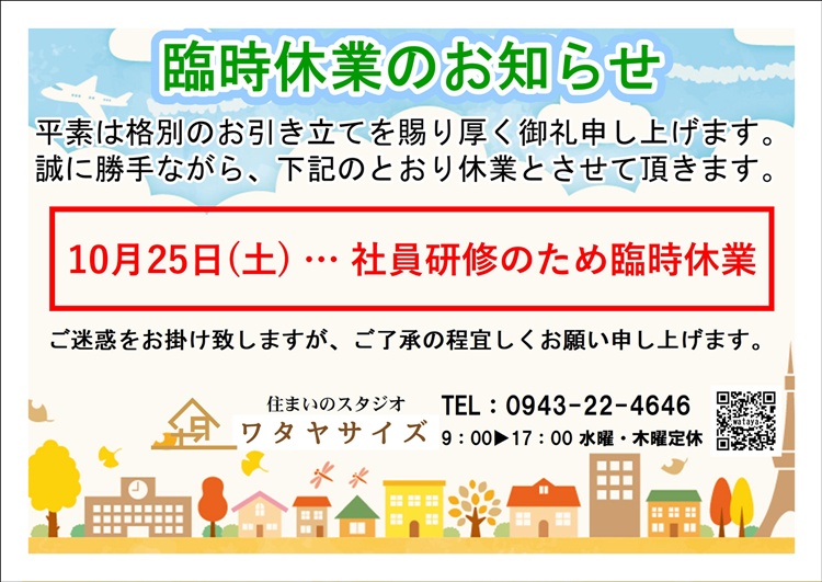 臨時休業のお知らせ 10月25日(土)は社員研修の為、臨時休業とさせて頂きます。 ご迷惑をおかけいたしますが、ご了承の程よろしくお願い申し上げます。