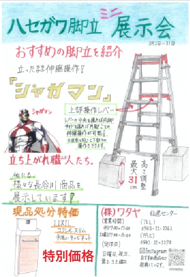 3月2日(月)~31日(火)まで「ハセガワ脚立ミニ展示会」を開催いたします。 ハセガワの脚立をこの機会にぜひご覧ください。立ったまま伸縮操作が出来る脚立など!おすすめです!! その他、様々なハセガワ商品を展示しております。 皆様のご来店をお待ちしております。